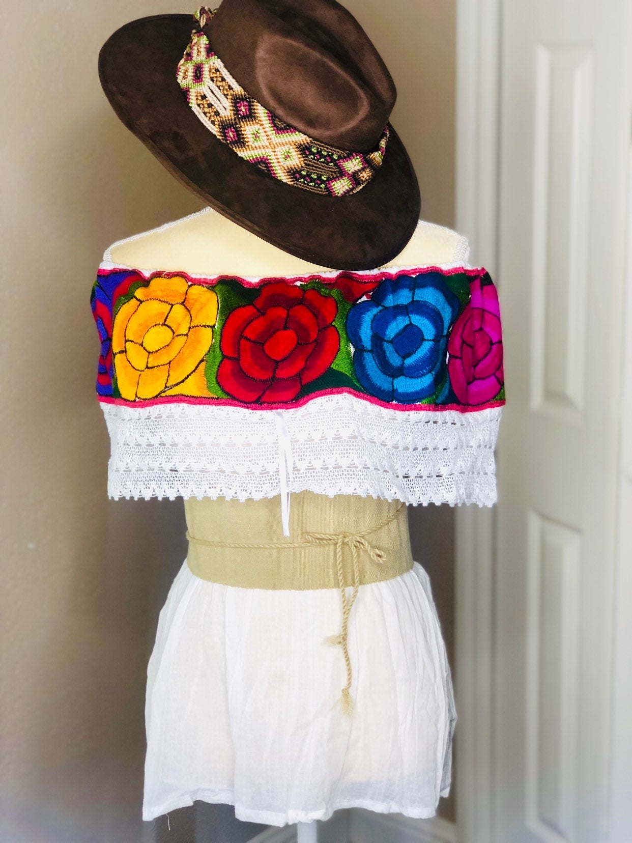 Best fits Xs- Small, median and large One size Mexican Embroidery off the shoulders Off the shoulders Blouse 23” bust 46 “ all around bust Color flowers will vary on each unique blouse!